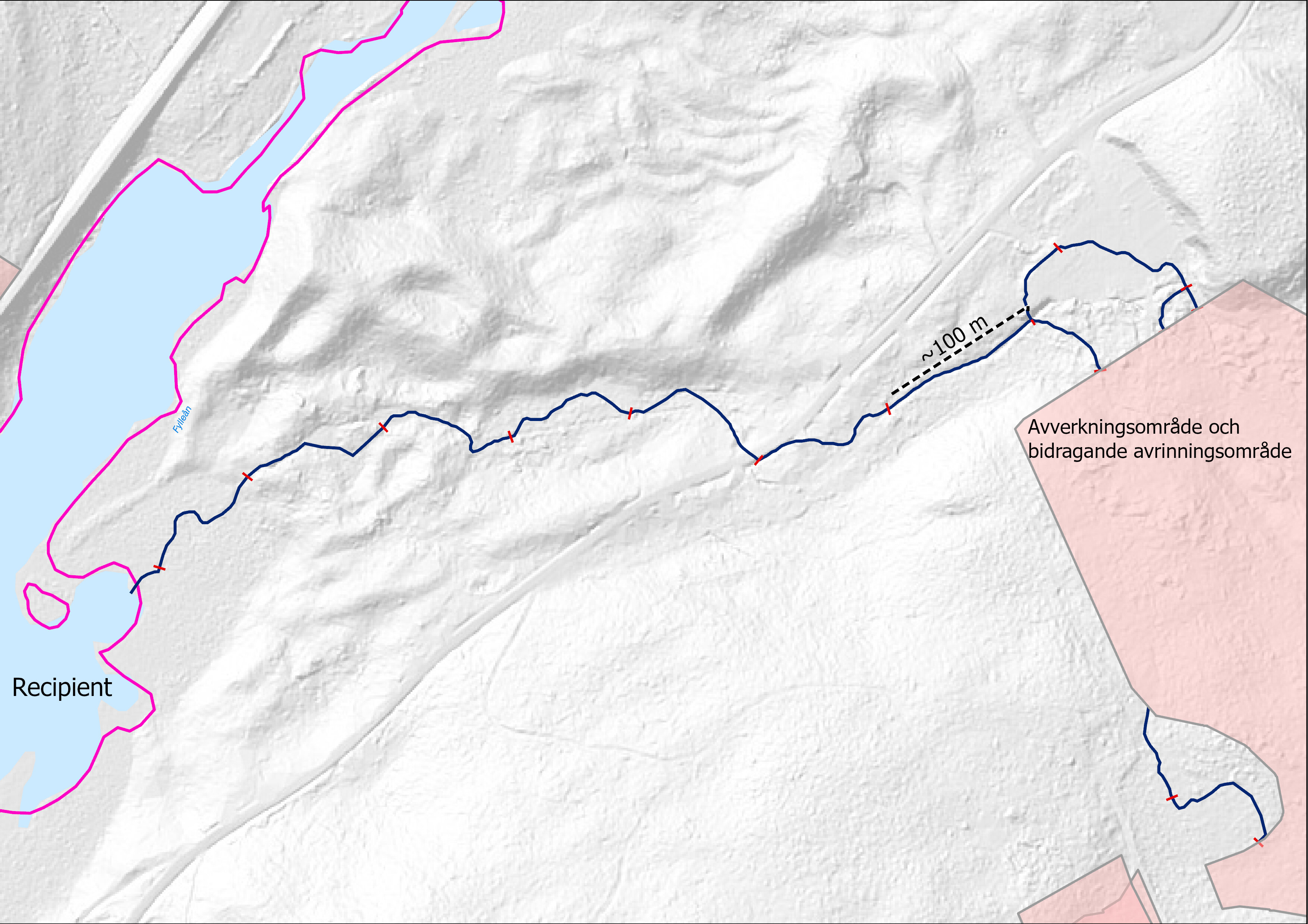 Rinnvägar nedströms ett ärendeområde delas upp i segment om valfritt antal meter i den mån det är möjligt. Syftet med uppdelningen är att möjliggöra statistisk sammanställning av karaktärer för rinnvägarna som t.ex. lutning, sedimenttransport och flödesackumulering. Figur 4.2.1.A visar ett exempel på hur en sådan segmentindelning kan se ut. Identiteter för ärendeområdet där rinnvägen startar och recipienten där rinnvägen slutar redovisas i attribut för varje segment.
